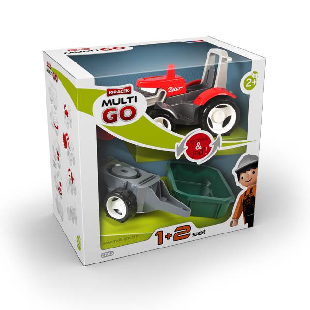 MultiGO jsou auta a traktory s praktickým bajonet systémem, který umožňuje snadnou výměnu korbiček a dalšího příslušenství. Balení obsahuje traktor, radlici, přívěs a korbičku. Velikost traktoru 22 cm. Vhodné pro děti od 2 let. Vyrobeno v České republice.