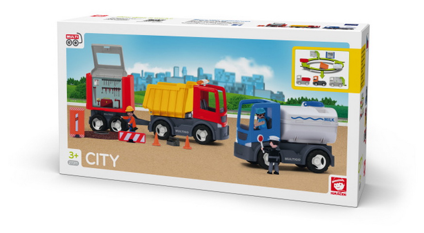 MultiGO jsou auta a traktory s praktickým bajonet systémem, který umožňuje snadnou výměnu korbiček a dalšího příslušenství. Balení obsahuje 2 náklaďáky, 2 majáky, přívěs, 3 vyměnitelné korbičky, 3 Igráčky a doplňky. Vyrobeno v České republice.